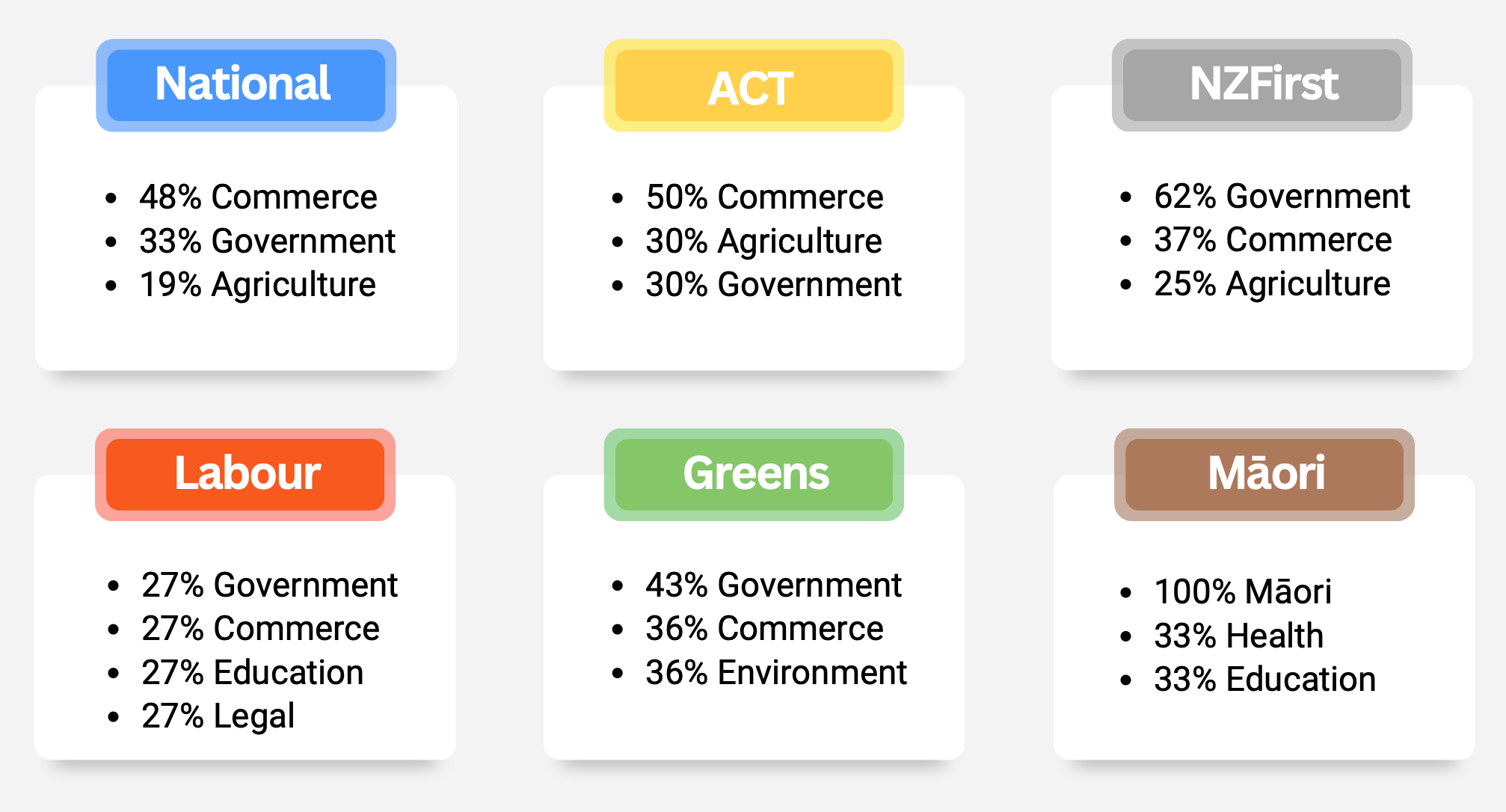 Business ownership is another key characteristic of current MPs. Either in the past or currently, a total of 42 MPs were found to be business owners. Here’s the breakdown of this by party: “17 National, 11 Labour, 8 ACT, 3 NZ First, 2 Greens, 1 Te Pati Maori.”