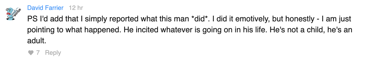 PS I’d add that I simply reported what this woman *did*. I did it emotively, but honestly – I am just pointing to what happened. She incited whatever is going on in her life. She’s not a child, she’s an adult.