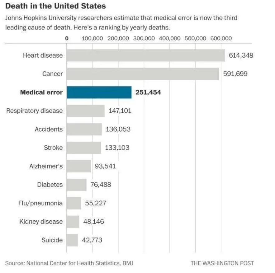 A 2016 BMJ analysis found that medical errors in healthcare facilities are actually incredibly common and may even be the third-leading cause of death in the US medical malpractice accounts for about 251,000 deaths every year – this is more than accidents, stroke, Alzheimer’s and respiratory disease: