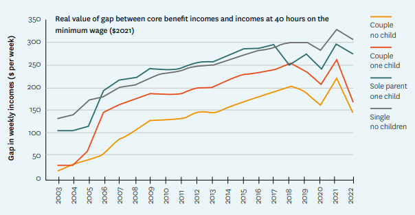 Until 2016 wage growth outstripped inflation hence the growing gap. Since 2019 benefits have been indexed to wages. Previously they were only indexed to inflation. Accordingly, the report notes the 2022 “main benefit increases reduced the gap”. That is, income from work became less attractive.