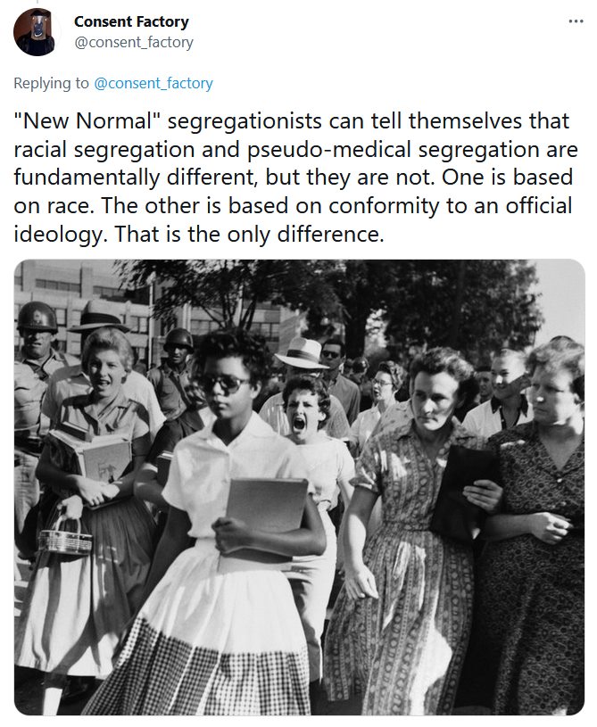 To begin with, we need to call things what they are. The “vaccination pass” system is a segregation system. It is segregationism. Call it what it is. Those cooperating with it are segregationists. They’re not “helping” or “protecting” anybody from anything. They are segregationists, pure and simple. Refer to them as “segregationists.” Don’t let them hide behind their terminology. Confront them with the fact of what they are.