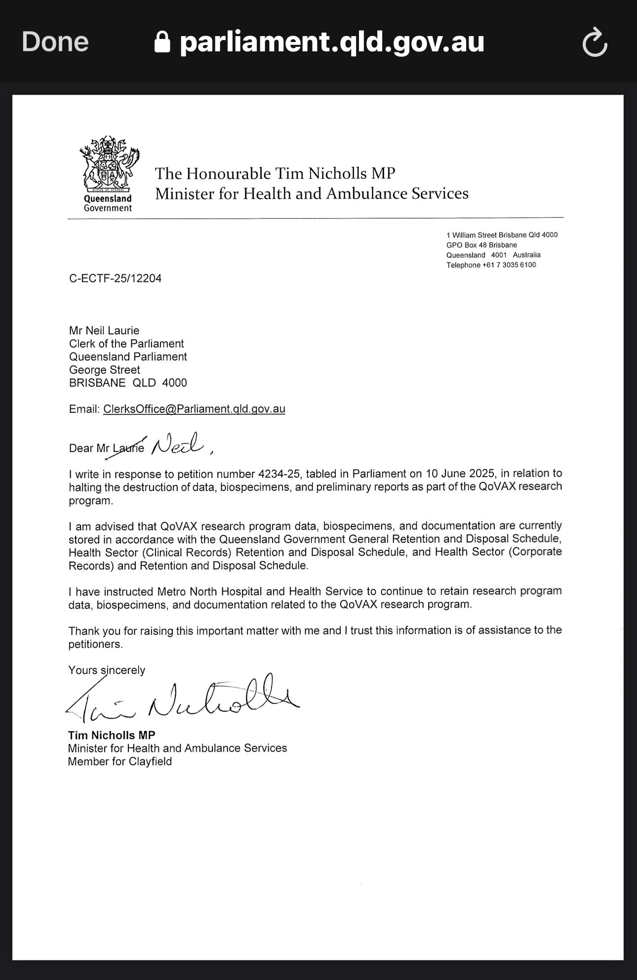 At the end of July 2025, Metro North Health confirmed, apparently on instruction from the minister, that the QoVAX research program data, biospecimens and documentation would not be prematurely destroyed. This is a consequential win for research ethics in the face of ongoing corruption and coverups at a time when population health faces a potential catastrophe.