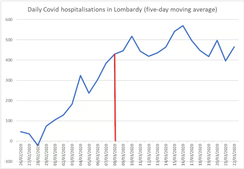Stop Press: Heneghan and Tom Jefferson provide data from Lombardy which show behaviour change was not needed to bring down the first wave. Italy was locked down from March 8th (starting with the North), a date which coincided with when new daily Covid hospitalisations plateaued, as the following chart shows. Since new infections precede hospitalisations by at least a week, this indicates that the epidemic had stopped its explosive growth well before the lockdown.