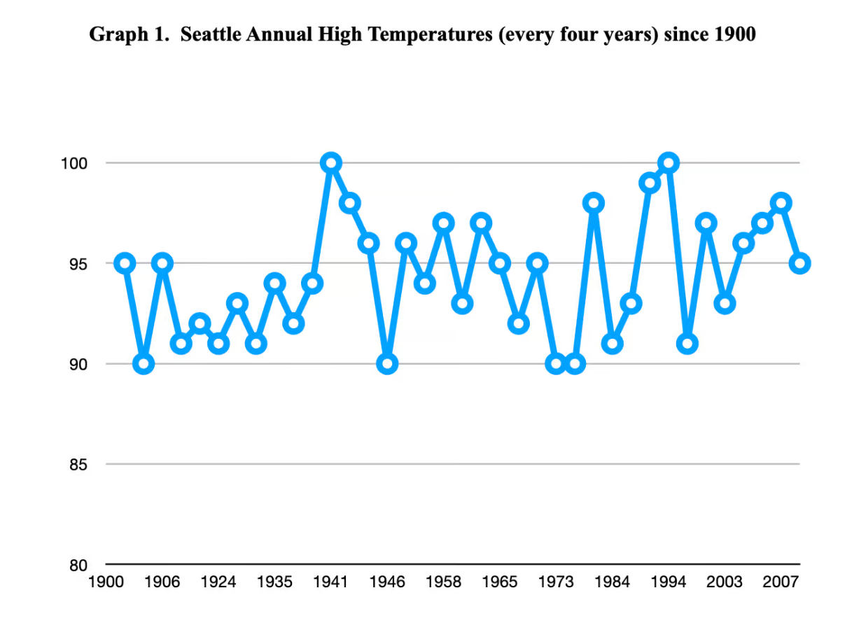 I went back to the records for Seattle going back to 1900. Because of the extensive amount of data, I randomly chose the maximum temperature recorded for Seattle and I did that for every four years. That data is presented below in Graph 1. Yes, I intentionally ‘skipped’ data on a consistent pattern to save space but you can go to the data and do your own full plot and see what the graph looks like.