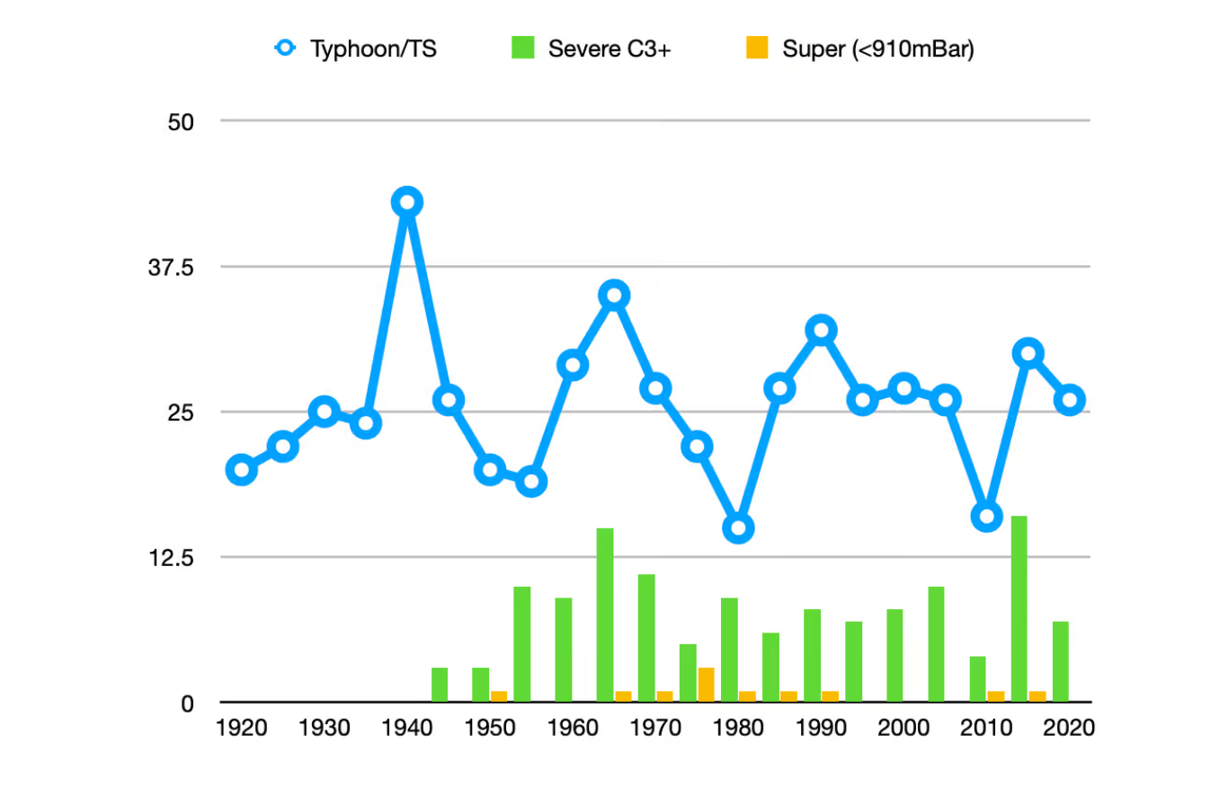 For disclosure, over time, there have been attempts to standardize the definition of typhoon but that is still being smoothed out. I established my own definitions based upon the data available. For the total numbers each season (in blue), any storm classified as a tropical storm or greater was counted. The green represents a severe typhoon based upon the more recent categorization as a level 3 or greater (which began in the 1940s). Finally, I added a category that I called the ‘super’ typhoon and since there is still no consensus on this definition (now only referred to as “violent”), I used the central pressure of 910 millibars or less as a definition to be consistent (measurements of pressures also only began in the late 1940s).