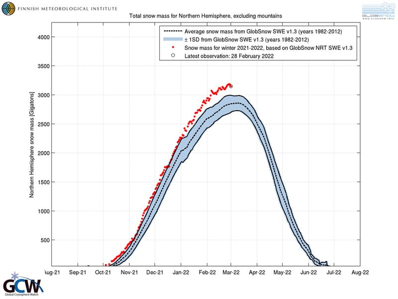 And the snow pack data, as the northern hemisphere rolls out of winter and into spring, shows no signs of decline due to the runaway global warming. Some 14% above the long-term average. (Northern hemisphere meteorological winter ends on 28 February.)