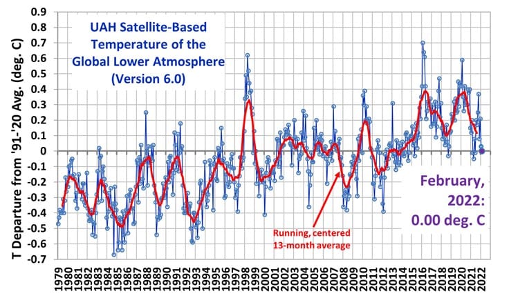 According to the boffins who collect this data (as in actual measurements, not model predictions), the global average lower tropospheric temperature anomaly for February, 2022 was 0.00°C above the long-term average from 1991 – 2020.