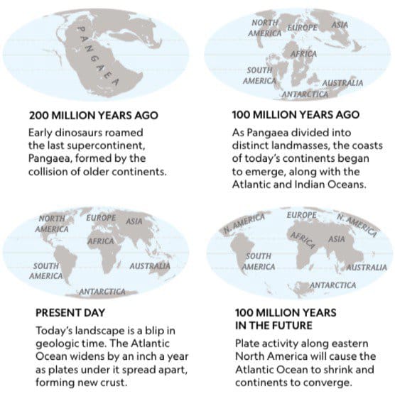 The continents were once locked together in an ancient supercontinent dubbed Pangaea. Plate tectonics later broke Pangaea into Gondwana and Laurasia. Those, too, eventually broke apart into the shapes we recognise today.