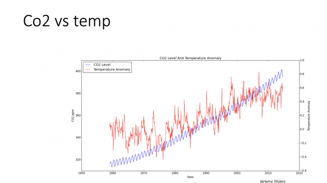 A steady rise since the 1950s in Co2 and an overall rise in temps but two noticeable deviations from the correlation.