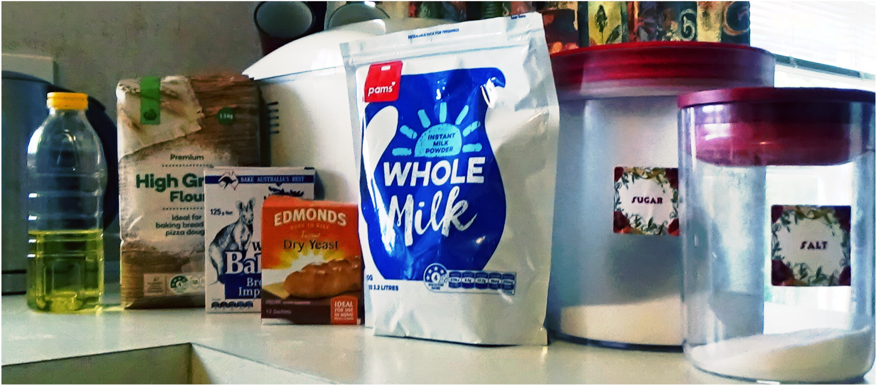- Yeast 1 sachet (Edmonds Instant Dry Yeast) (provides the rising)