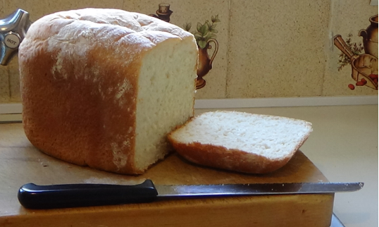 My recent effort ended up with me injured, although the loaf I produced was the best I’d ever managed. How could you get injured, I hear you ask? Simple. I had the ingredients placed in the receptacle, switched on the machine only to find it had decided to expire. So hand kneading was the order of the day. And this upset my long term spinal problem, returning me to a walking stick. The loaf was baked in the oven.