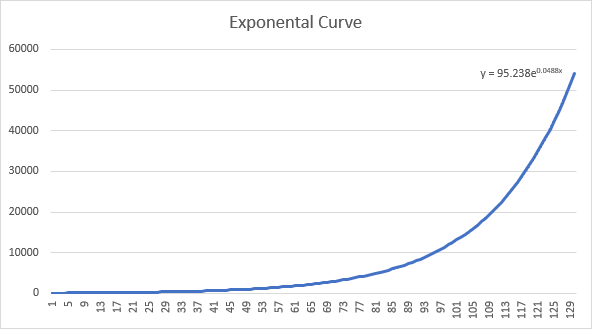 But it is worse than that. The way that the current “fiat” money system is set up means that an increase in money supply is inevitable. And inflation is inevitable. Moreover, this increase is exponential. It starts off flat for many, many years. But ultimately ends up very steep as we follow the curve over time.
