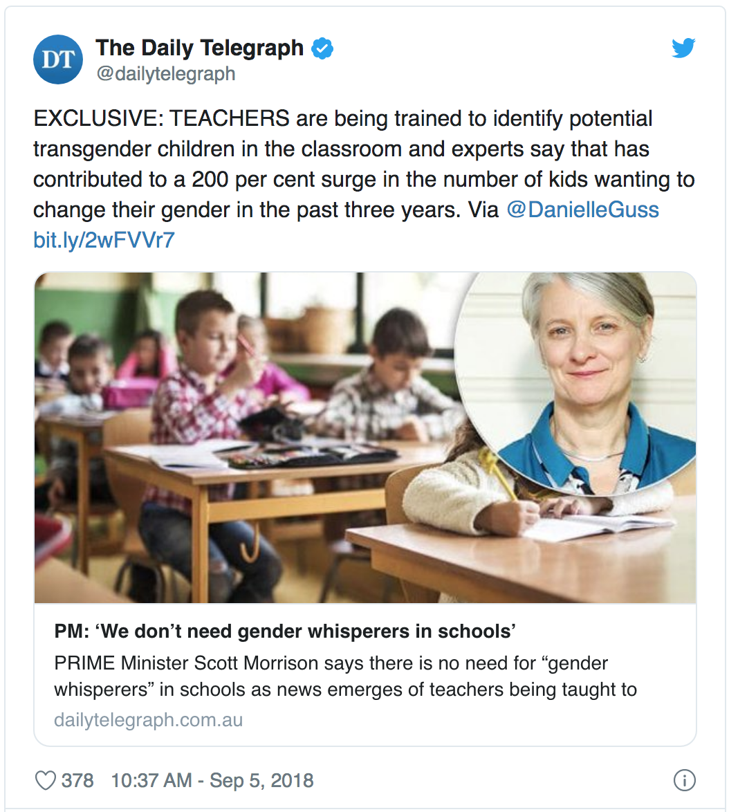 Australia already has Gender whisperers in schools identifying children who may potentially be trapped in the wrong body, even though the child may not even be distressed or notice that they act in a more effeminate or masculine way than the other boys and girls.