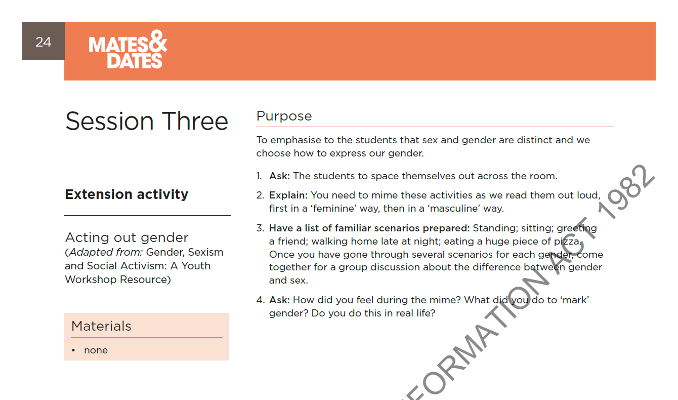These concepts are taught using incredibly manipulative exercises and conflation of terminology. A Mates & Dates facilitator has advised that resources such as the genderbread person, though not officially sanctioned by ACC, are being used.