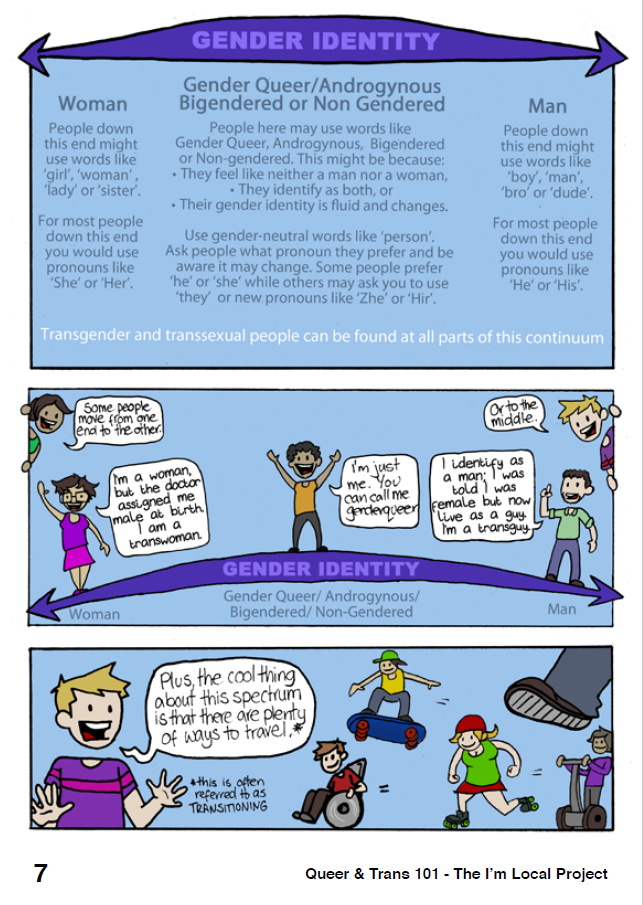 I’m Local is a free resource RainbowYouth has made available, which explains on one page the concept of gender identity and makes it clear a child can travel and some people move from one end to the other.