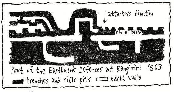 The government army follows the King Maori south up the Waipa River. At Paterangi the King Maori have built intricate defences of zig-zag rifle pits secluded in fern-covered ridges. But the government is persuaded by the Loyal Maori not to attack. So they don’t. This angers the King Maori who want to be attacked. There is a skirmish at Mangapiko (11 February 1864) and a government attack at Hairini. The King Maori retreat south to Orakau. The chief leading the King Maori is Rewi Maniapoto.