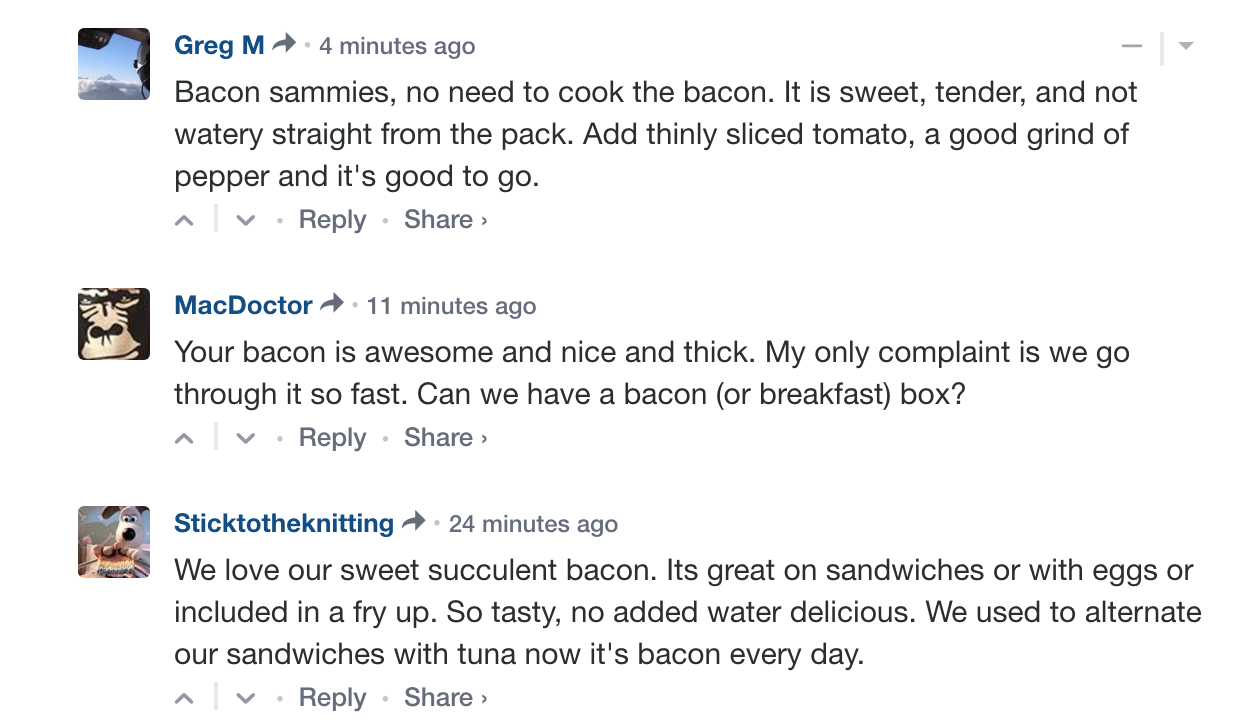 Many Whale Meat Company customers have had their lives changed forever as they have tried Whale Meat bacon and found that they could never go back to the soupy, tasteless offerings that proliferate in the supermarket chillers.