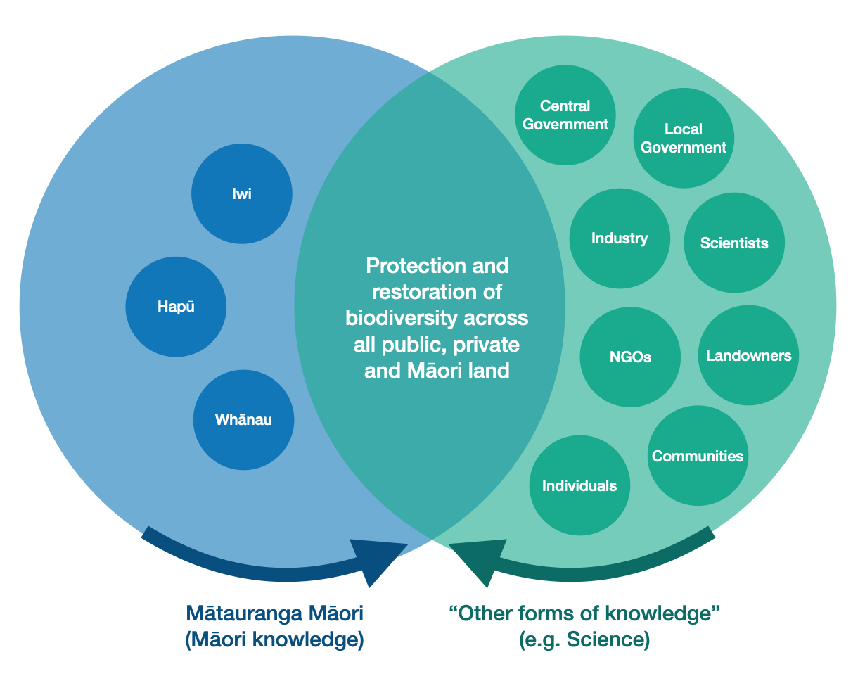 A key objective is for matauranga Maori to be invested in and have “equal mana to knowledge gained through other scientific disciplines and ways of seeing/understanding the world”. You could think of it as two equally sized spheres, coming together in partnership, with the protection and restoration of biodiversity at the centre. One sphere would represent whanau / hapu / iwi, and the other central government / local government / industry / non-government organisations (NGOs) / scientists, landowners / communities / individuals. This structure is a microcosm of the intention for the future governance of New Zealand, as proposed in both the He Puapua and Matike Mai reports.