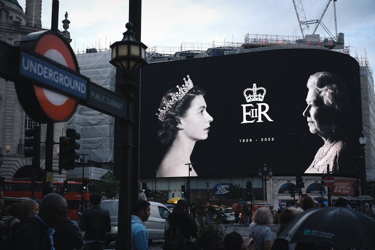 Dorothy Wilding’s 1952 photographs of Queen Elizabeth II, taken just weeks after her accession, were also shared widely during the period of mourning. British curator and author Val Williams described Wilding’s ability to make women “look as they had never looked before … uncompromisingly modern”. One of her portraits also illustrated British postage stamps between 1952 and 1967. Soon after the Queen’s death, the immediately recognisable profile of a youthful monarch wearing a tiara replaced rolling advertising on the vast electronic display at London’s Piccadilly Circus.