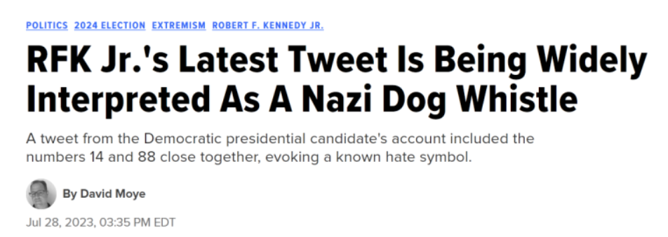 Goldstein Number Two is RFK, Jr, the infamous anti-vax conspiracy theorist, who is also Hitler, or is aligned with Trump, who is literally Hitler, and Osama bin Laden, and a Russian asset! Yes, that’s right, in addition to all his conspiracy-theorizing and anti-vaxxing, Bobby, Jr has been tweeting secret “Nazi dog whistles”, presumably at the behest of Trump, who is presumably taking direct orders from Putin!
