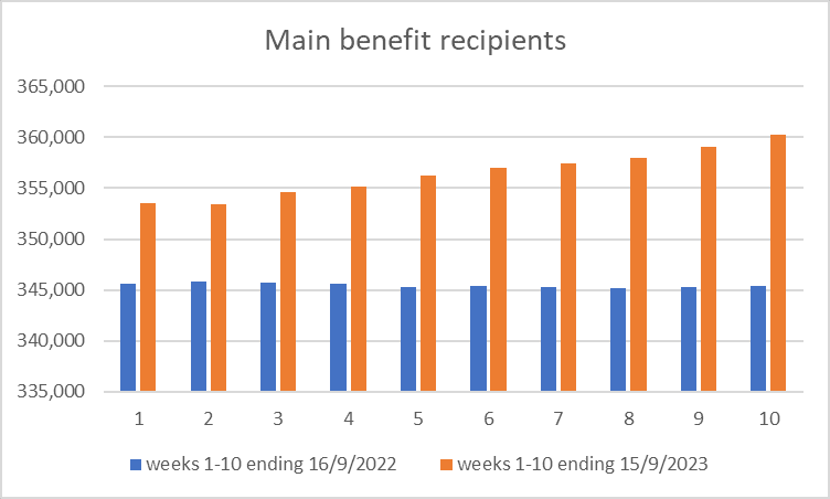 Because there is a seasonal component to benefit number fluctuations, it is crucial to compare like with like. In the 10-week period to September 15, 2023, the number of people on a main benefit has risen by 6,768 or almost two per cent, whereas in the 10-week period ending September 16, 2022, the numbers were virtually flat with a very small decrease of 141 recipients.