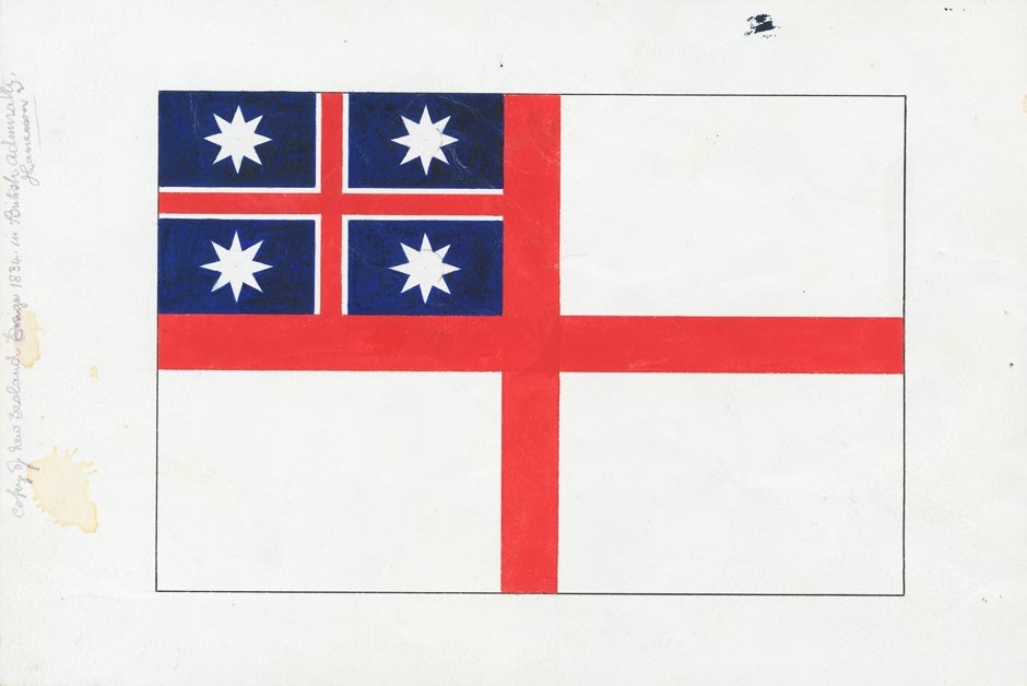 This was New Zealand’s first official flag. It was selected on 20 March 1834 by 25 chiefs from the Far North who, with their followers, had gathered at Waitangi in the Bay of Islands. Missionaries, settlers and the commanders of 13 ships were also present. The official British Resident, James Busby, made a speech and then asked each chief to come forward in turn and select a flag from three possibilities. The son of one of the chiefs recorded the votes. A flag based on the St George’s cross that was already used by the Church Missionary Society is said to have received 12 votes, the other designs 10 and 3. Busby declared the chosen flag the national flag of New Zealand and had it hoisted on a flagpole to a 21-gun salute from HMS Alligator.