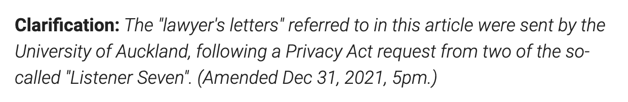 Clarification: The “lawyer’s letters” referred to in this article were sent by the University of Auckland, following a Privacy Act request from two of the so-called “Listener Seven”. (Amended Dec 31, 2021, 5 pm.)
