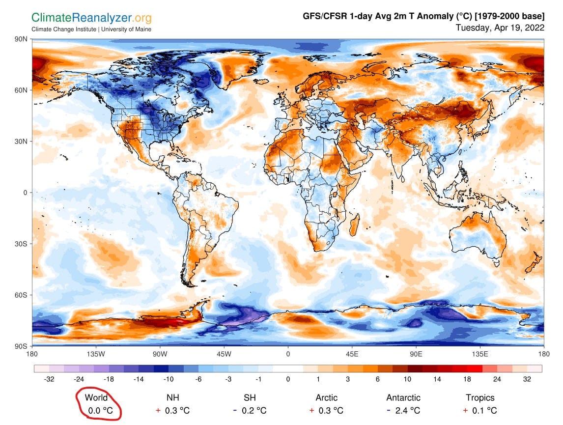 On April 19 2022 the runaway catastrophic anthropogenic global warming temperature anomaly had reached the dizzying heights of exactly 0.0 °C above the long term average temperatures on April 19 for the period 1979–2000.