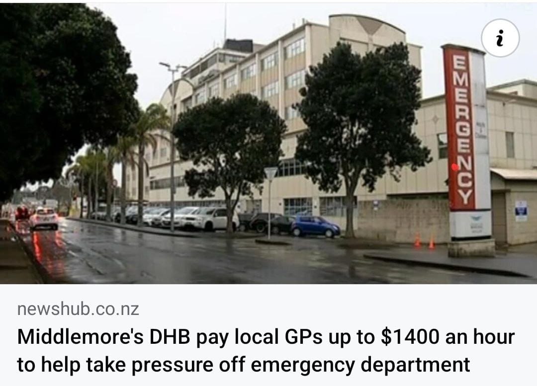 “Middlemore’s DHB funded local GPs up to $1400 an hour over the weekend to help take the pressure off its emergency department.Twenty-seven general practices in South Auckland offered free appointments over the weekend at the request of Counties Manukau District Health Board, and will do it next week too, because Middlemore Hospital’s ED has been overwhelmed.”