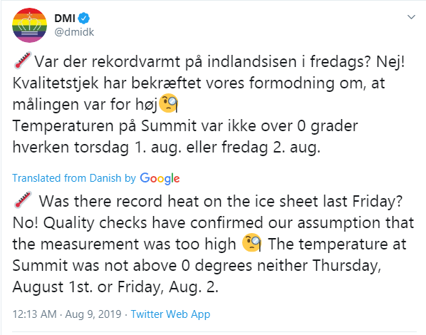Oh dear, this from the Danish Meteorological Institute itself – not record heat waves on the ice like the alarmists have been screaming about for the last few days just faulty equipment/readings.