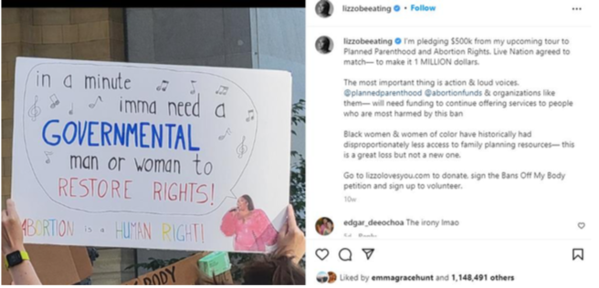 Lizzo insists “by this ban” – which ‘ban?’ Either she genuinely believes that the decision has resulted in a Nationwide abortion ‘ban’ or is intentionally using false, inflammatory speech to start a contagion of moral outrage. With an Instagram following of 13 million (many of which are young, devoted females) and the above post receiving over 1.1 million ‘likes,’ either option seems at best, deeply dangerous.