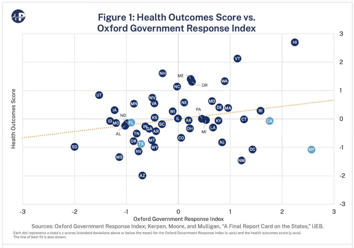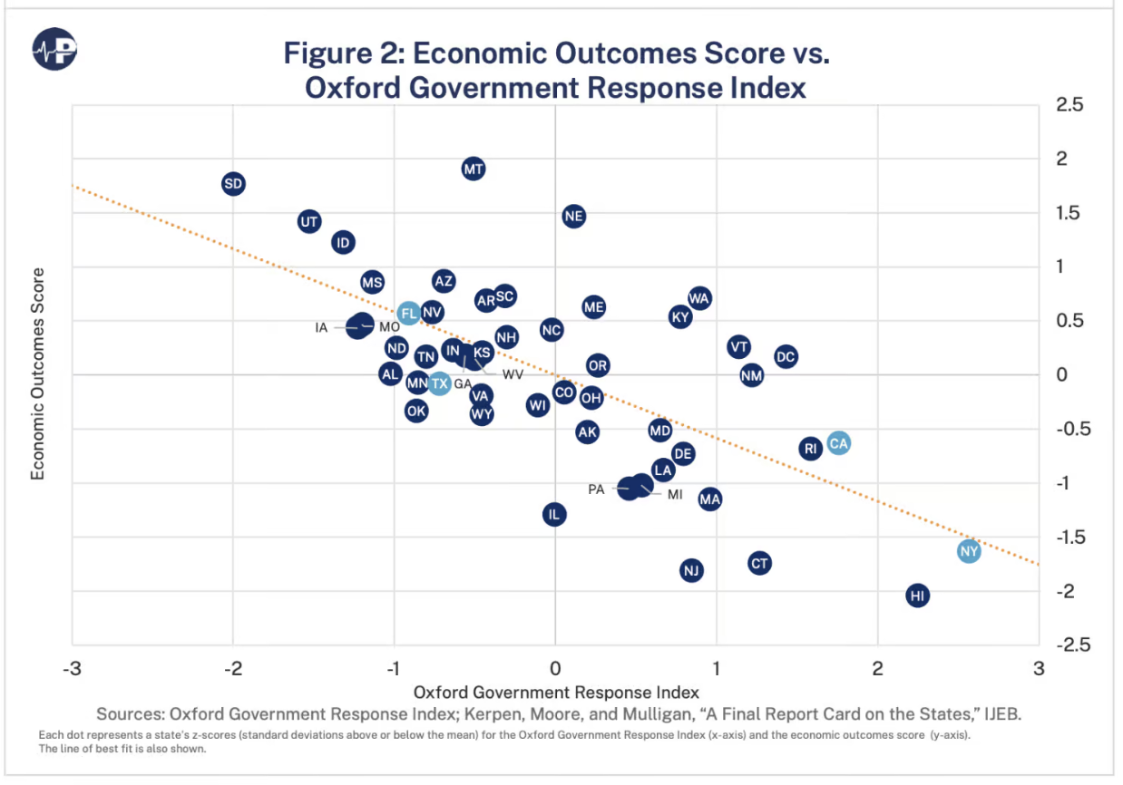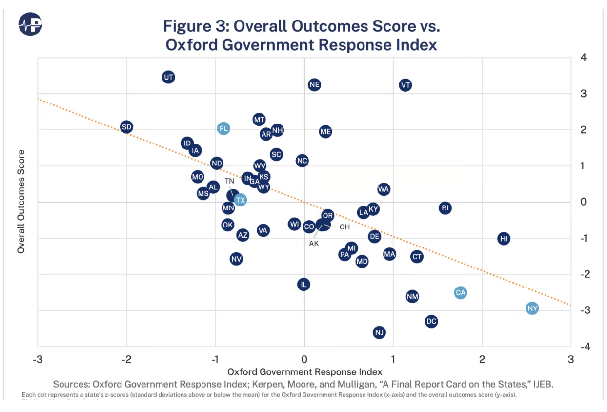 “Our results show that more severe government interventions, as measured by the Oxford index, did not significantly improve health outcomes (age-adjusted and pre-existing-condition adjusted COVID mortality and all-cause excess mortality) in states that imposed them relative to states that imposed less restrictive measures. But the severity of the government response was strongly correlated with worse economic (increased unemployment and decreased GDP) and educational (days of in-person schooling) outcomes and with a worse overall COVID outcomes score that equally weighted the health, economic, and educational outcomes.