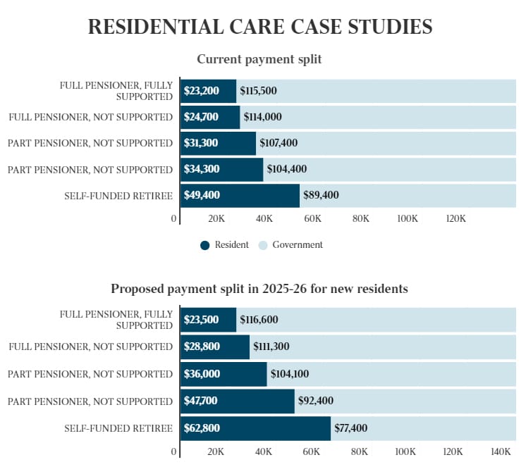 According to case studies circulated by the government, a self-refunded retiree with an income of $70,000 and $500,000 in assets, excluding the family home, would see their contributions rise from $49,400 to $62,800 a year. A part-pensioner with $500,000 in assets would see their fees rise from $34,300 a year to $47,700. A full pensioner who owns their own home and has other assets worth $150,000 would pay $28,800, or an extra $3000 a year.