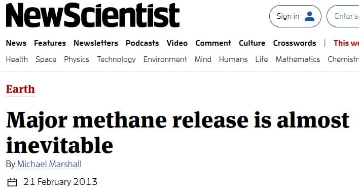 It is not clear how many a “few tenths of a degree” is, but the world has warmed a few tenths of a degree since 2013, so they tell us (every year is the ‘hottest eva’), and I have yet to smell the result of this major methane release. (Since it did not happen, we now have to blame cow farts as the methane source and ban farming.)
