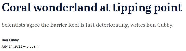 Since the Arctic tipping point had to be abandoned, in 2012 it was time to move to warmer waters, with the Great Barrier Reef at a tipping point according to the Sydney Morning Herald.