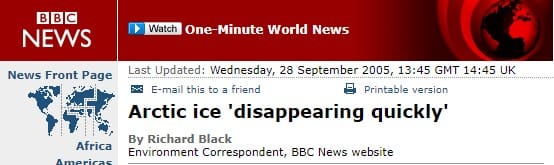In 2005 the BBC reported, in an article titled Arctic ice ‘disappearing quickly’: