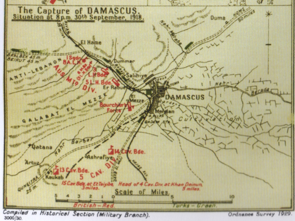 Early next day the ALH 10th Regiment representing the 3rd ALH Brigade would accept surrender from the Mayor of Damascus without resistance, although that honour had been pre-arranged as to be performed by the master tactician, but better self-publicist, T E Lawrence (of Arabia) and his Arab troops as a political statement. So the ‘surrender’ was re-performed for posterity three hours later, after Lawrence arrived, but not before overjoyed crowds of Damascans feted the dusty ‘Diggers’.