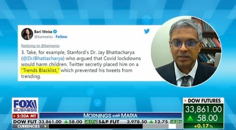 Social media companies censored the declaration because it contradicted the narrative that the COVID-19 science was “settled” and that all qualified doctors agreed on masking and lockdowns. Bhattacharya’s tweet of the declaration immediately marked him for Twitter targeting.