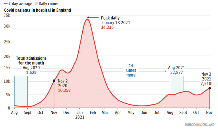 The statistics for November 2 show 7,510 in hospital with Covid-19 in England, compared with 10,397 the same time last year.
