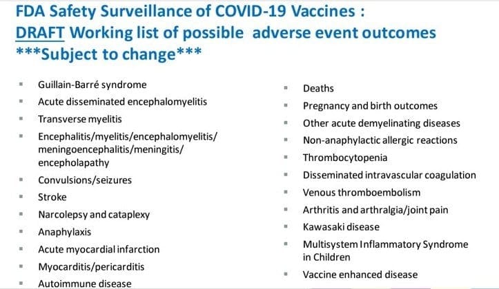 The public and health professionals have been advised that adverse effects are mild and short-lived and consist of things like pain at the injection site, fever, headache, aches and pains. However, as part of world-wide post marketing surveillance, the Global Vaccine Data Network (based in New Zealand) is actually monitoring the whole population of NZ for adverse effects of special interest (AESIs). This is a long list of serious life-threatening conditions that were not mentioned at all to the public as possibly related to the vaccine.