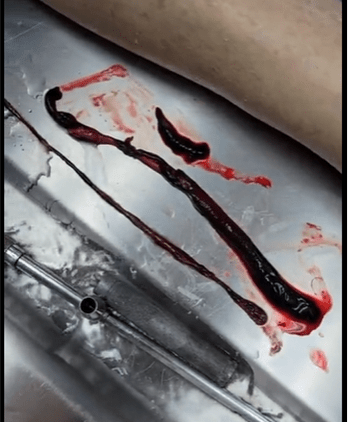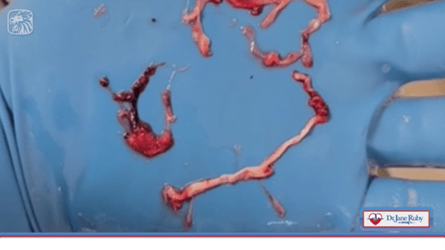 Below are long strands of fibrous tissue extracted from vessels during the embalming process, often with blood clots attached to one end suggestive of vaccine injuries.