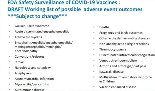 At the Vaccines and Related Biological Products Advisory Committee (VRBPAC) Meeting on October 22, 2020, a presentation was given titled “Plans for Monitoring COVID-19 Vaccine Safety and Effectiveness”. The slide below lists possible adverse events that were expected to be seen. These listed medical events were not randomly selected but were based on evidence from the clinical trial data and from data previously known about the vaccine technology and components.