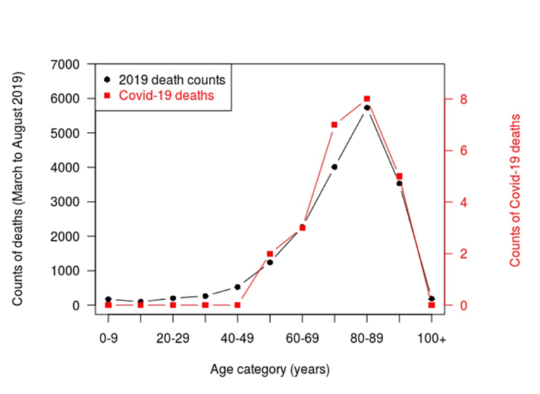 - Covid-19 deaths in New Zealand occur at about the same age (red line) as background (black line: figure 1). In fact, the two age distributions are statistically indistinguishable (P = 0.998). This could be a freak of the low covid-19 numbers in New Zealand, except that it is found again in almost every other country, no matter how many cases they’ve had. A German researcher found a very similar pattern in a country with 4.3 million cases, and with 94,000 cases. It is very difficult, even impossible, to reconcile the claim of 16 years of life lost per covid-19 death with age-at-death comparison. Doing so would mean that covid-19 is selectively targeting people who would otherwise live to the age of 98 years. This is simply implausible. It is hard to see how scientists could be so pessimistic, when the data on covid-19 deaths are shouting for optimism.