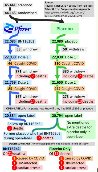 - No one is discussing is the downsides of the vaccine. In the following figure (not made by an official source) we see a summary of the highest level of evidence known about the Pfizer vaccine which is currently on offer in New Zealand. It summarizes the participants, covid-19 cases and overall deaths. I didn’t make this diagram, but I wish I had. When reading the Pfizer 6-month update, we see that 21 people died in the group vaccinated or eventually vaccinated, compared to 15 in the placebo group. This result does not fill me with confidence, even though the reduction in covid-19 cases was so dramatic in the vaccinated group compared to placebo.