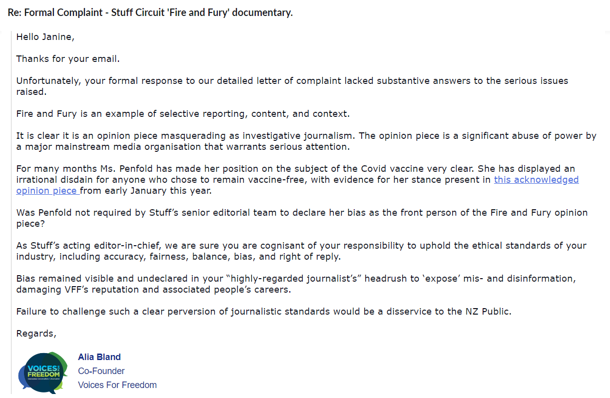 On September 9, VFF filed a formal complaint with Stuff regarding their Fire and Fury opinion piece.