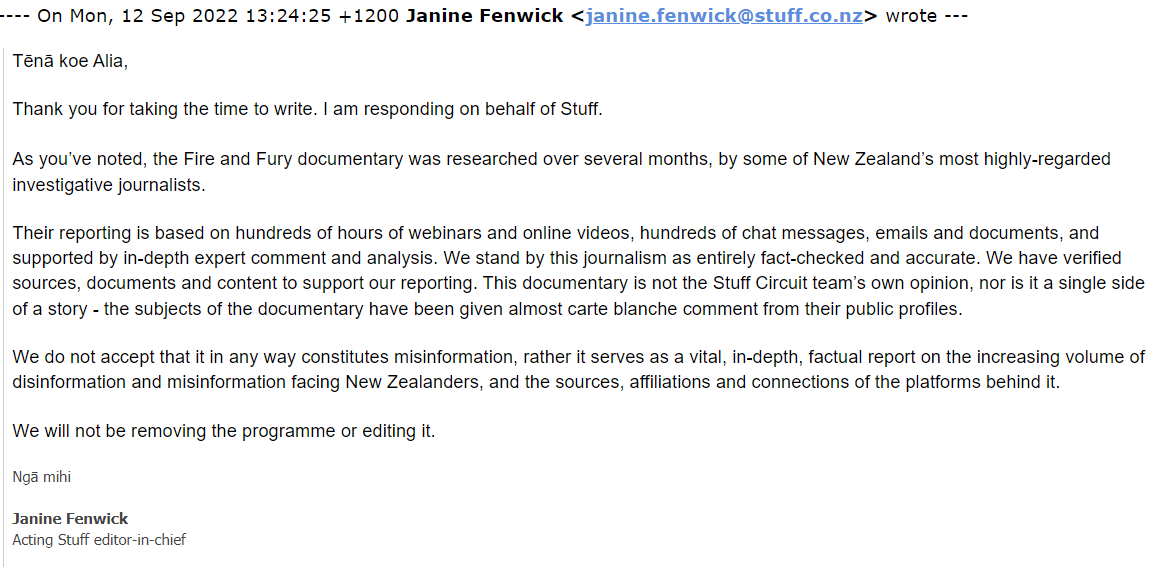On Friday 9 September 2022, VFF emailed its complaint regarding The Programme to Stuff’s Acting Stuff editor-in-chief, Janine Fenwick (VFF’s Complaint).