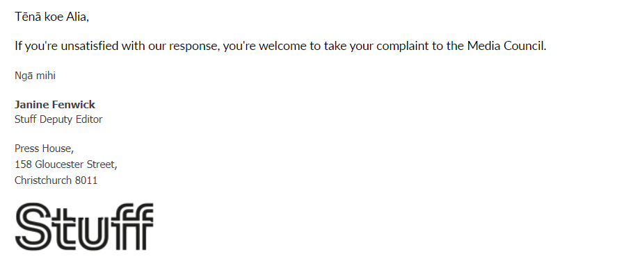 The complaint was filed on a Friday and by midday Monday we received the following reply from the Stuff Editor-in-Chief, Janine Fenwick.