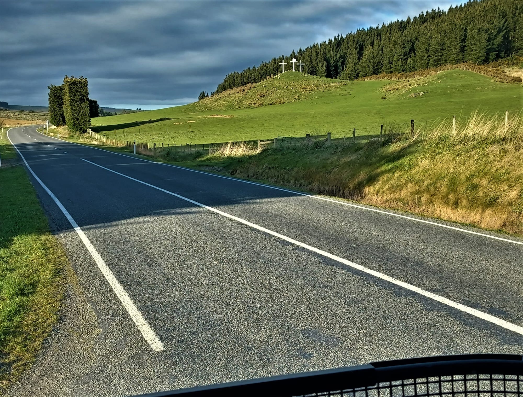 Yesterday’s photo was of three crosses erected on the hills on State Highway 77, Inland Scenic Route near Glentunnel. This is a local man’s memorial to his late wife.