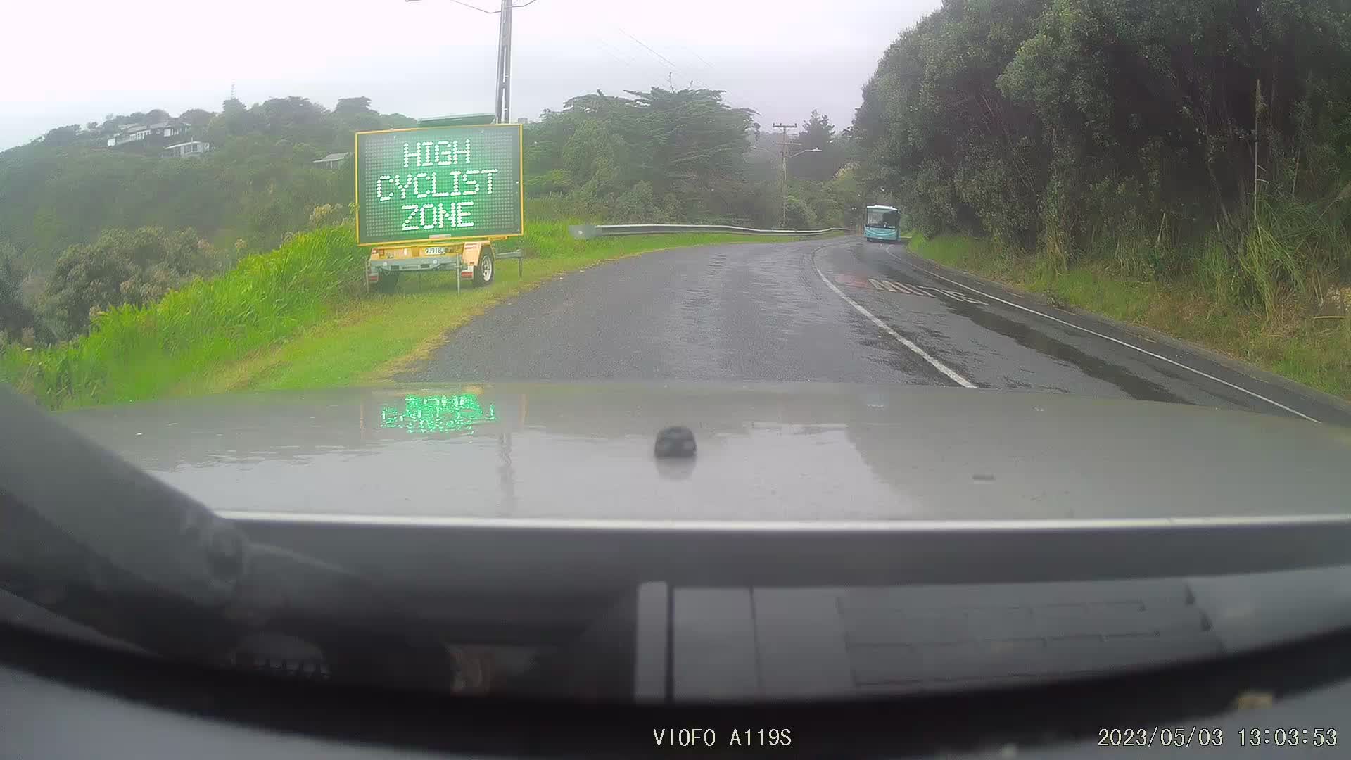 Yesterday’s photo was an Auckland Transport electronic sign warning of ‘High Cyclist Zone’ in an area of few to no cyclists. Taken from Oceanview Rd, above Little Oneroa Beach, Waiheke Island.