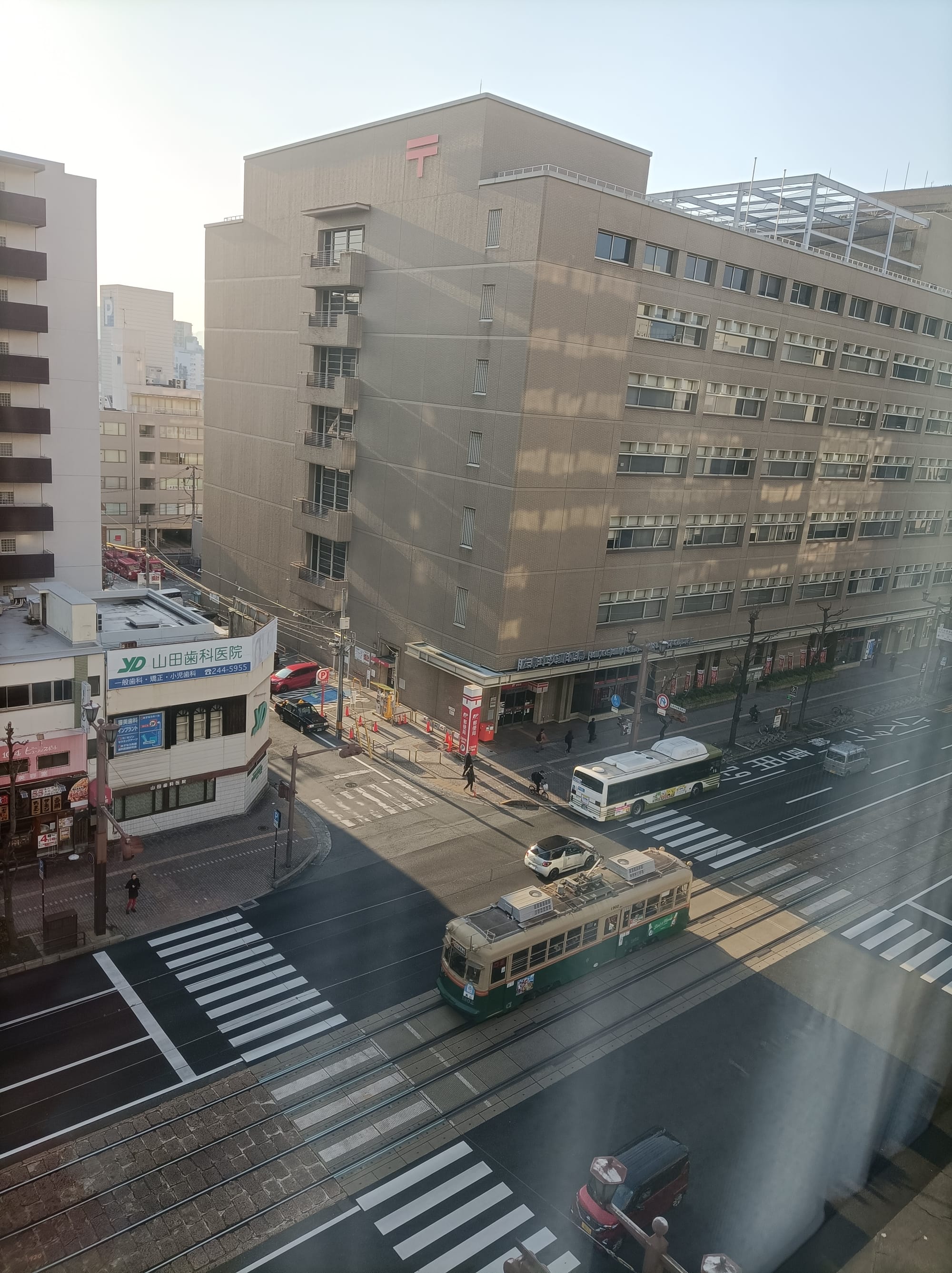 Yesterday’s photo was taken from the Comfort Hotel. The view is of the Japan Post building and heritage tram on Hondori St, Hiroshima.